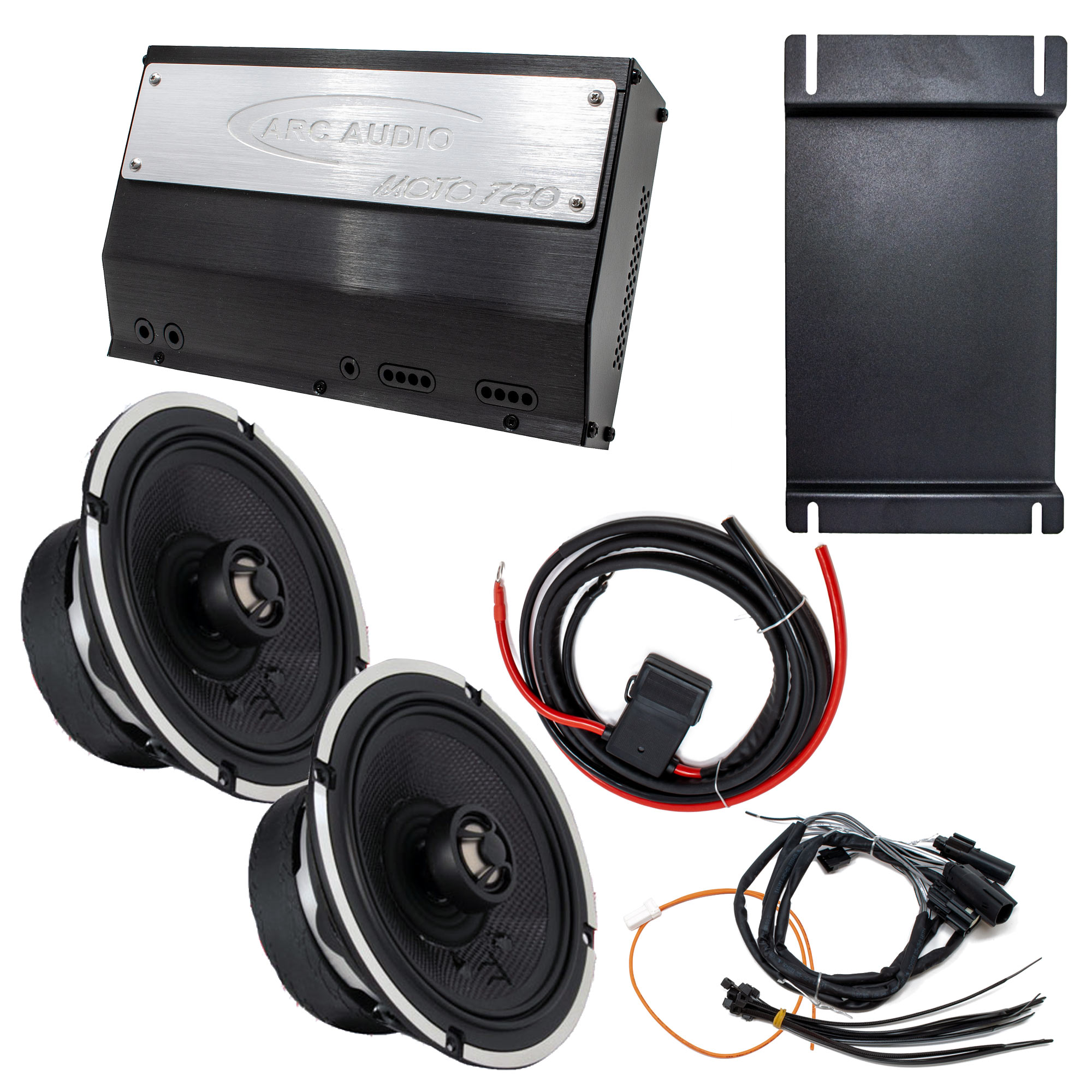 This MPAK kit includes the following products: MOTO720.4 Amplifier, a pair of MOTO602V2 Coaxial Speakers, a HD-FH2014 Wiring Harness Kit, and a RG15 Amplifier Mounting Kit
