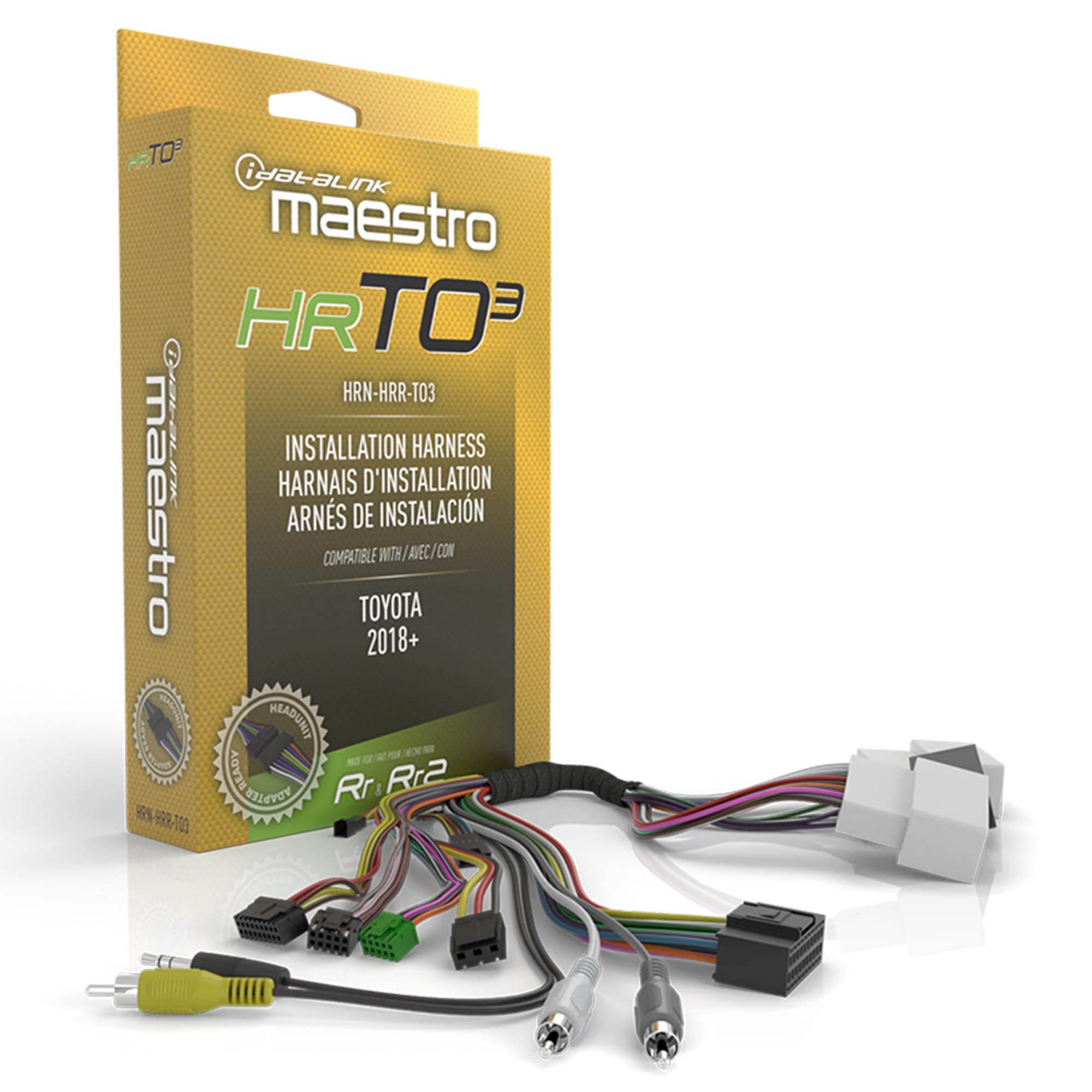 RR and RR2 compatible radio replacement harness for select 2018- UP Toyota vehicles. The radio side of the harness terminates in a universal connector that can be used in conjunction with available Maestro Head unit adapters for a plug n play solution or removed for conventional connections