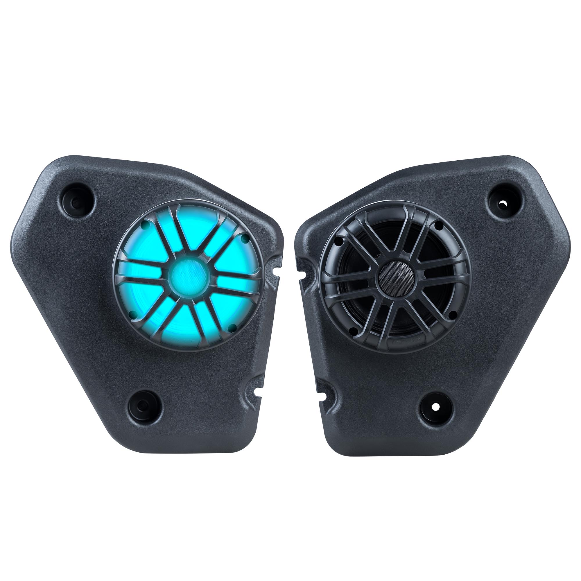 Memphis Audio direct fit OEM CanAm Defender rear speaker pods are designed to fit directly into your underneath the rear roof of your CanAm Defender with zero custom fabrication required. These lightweight durable rotomolded speaker enclosures are tuned for maximum output. The fully sealed design of these speakers make them one of the most durable direct-fit OEM solutions on the market. These speakers are specifically designed to work with factory CanAm Defender roof systems. These pods feature RGB LED illuminated cone as well as an RGB LED accent ring for an ultra-cool lighting effect. All the components used in this kit are marine grade and designed to withstand water and the elements.These speakers are only designed for Defender models with factory roof systems. If you do not have a roof, Memphis MXA62PS rear pods are an ideal solution for your vehicle.